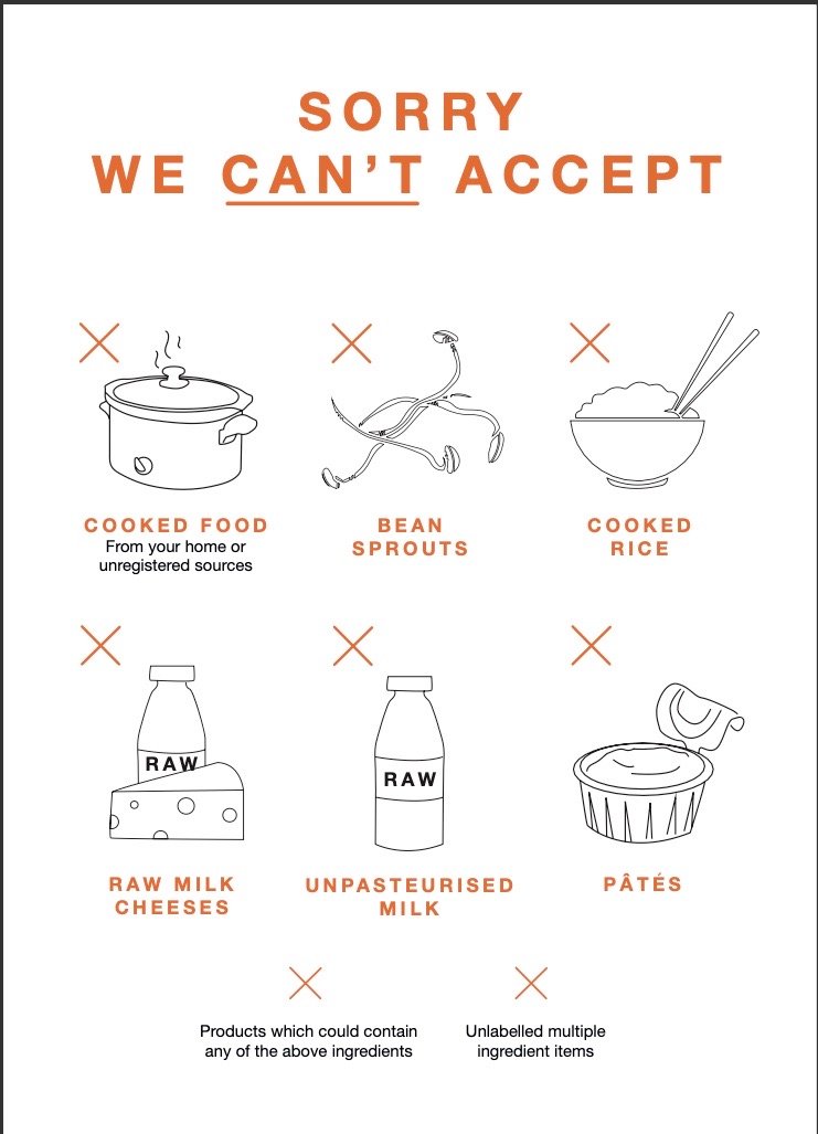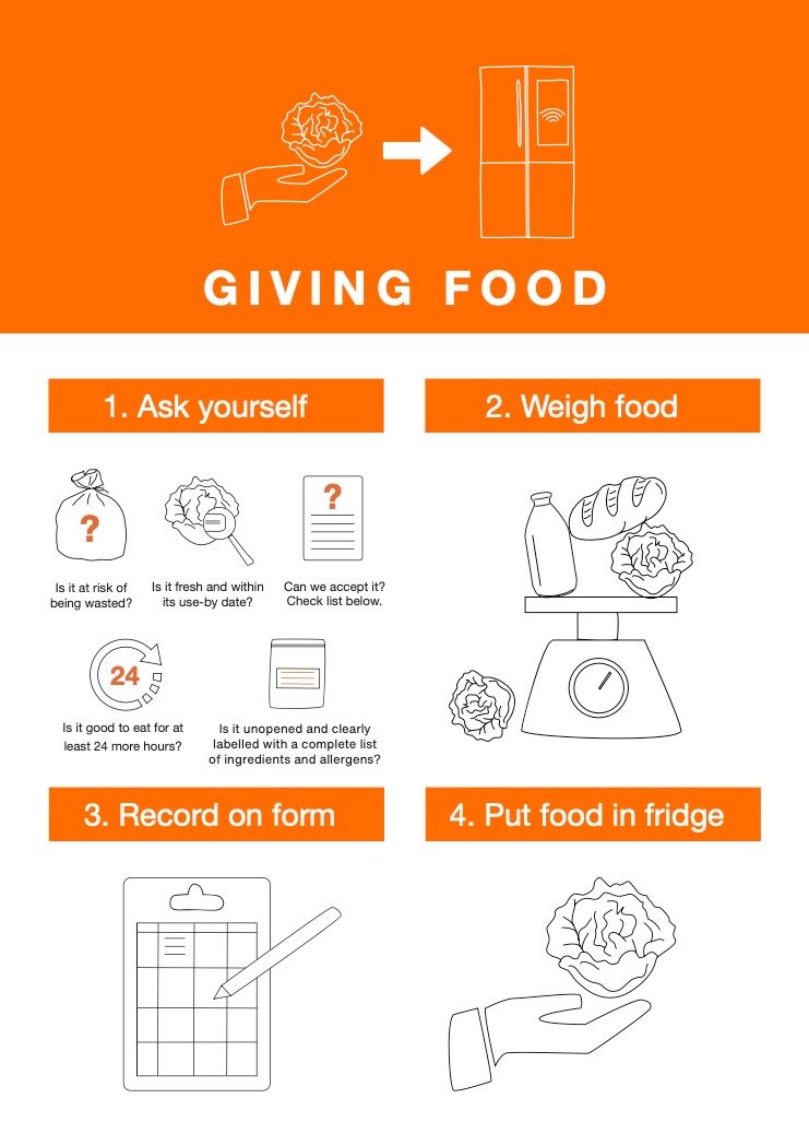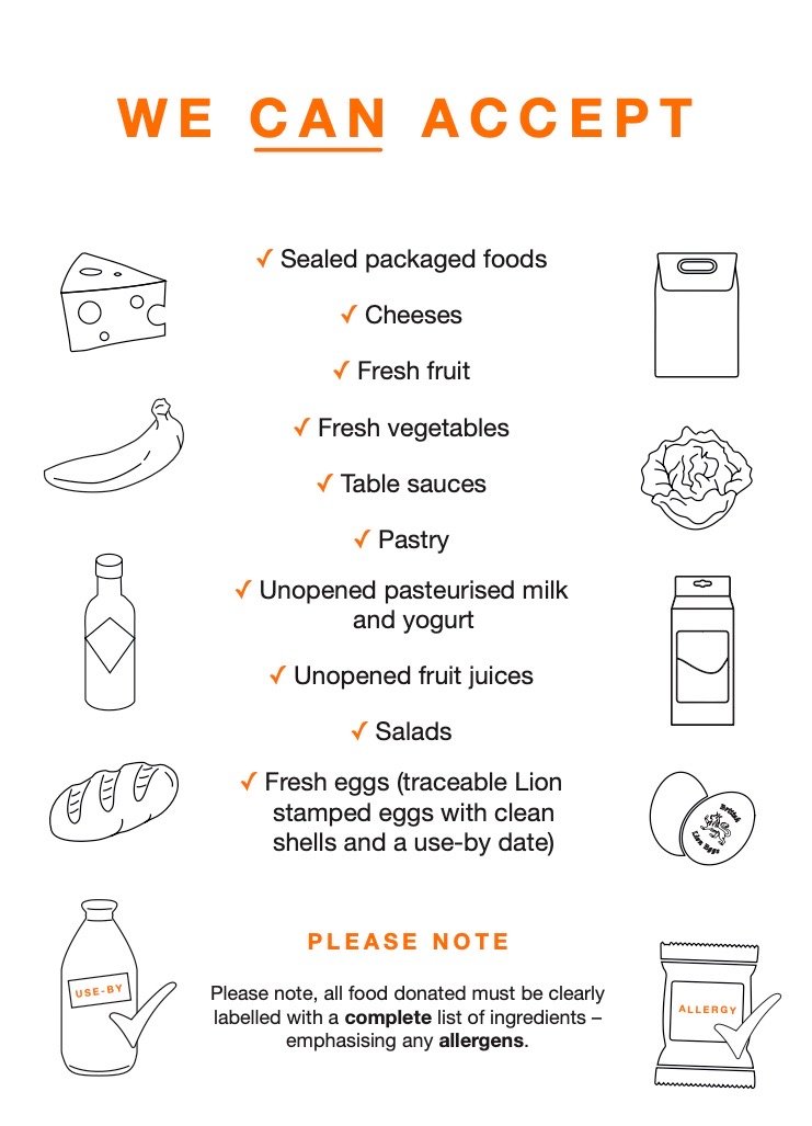 We will be filling the fridge twice a week with perfectly edible food left over from local supermarkets. Outside of these times, please feel free to place any items from the list below into the fridge that you don’t think you will consume.